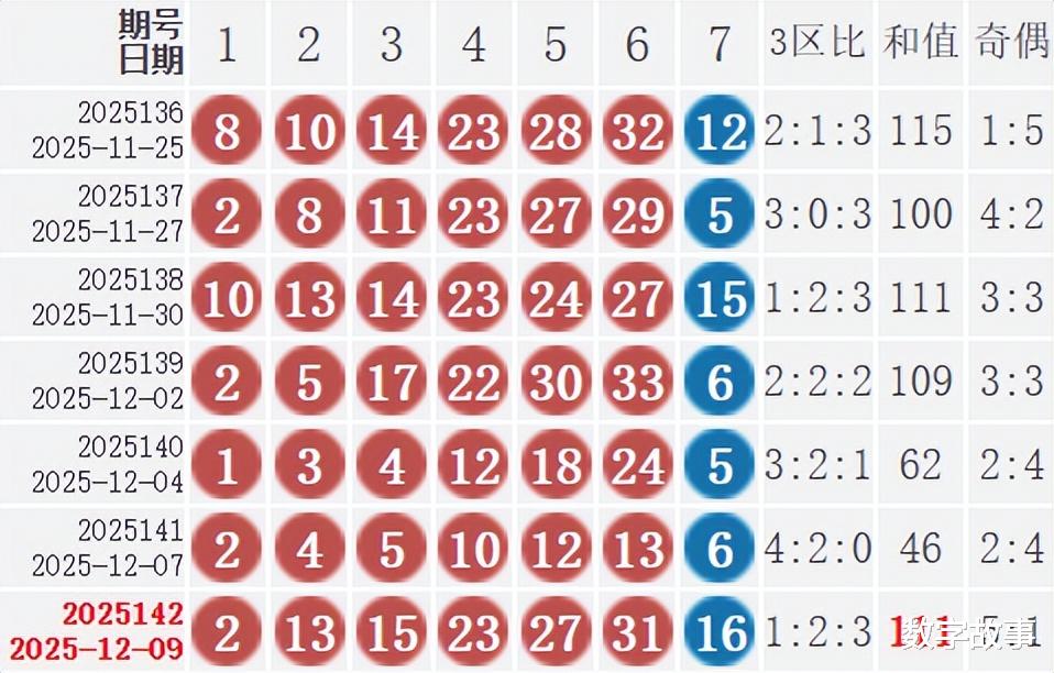 双色球25142期开奖结果及中奖情况:出奖时间: 2025-12-09 星期二 红球: 2-13-15-23-27-31蓝球: 16双色球红球重号叠码:2, 13红球奇偶比:5:1红球和值:111红球跨度:29 三区比:1:2:3没有连号