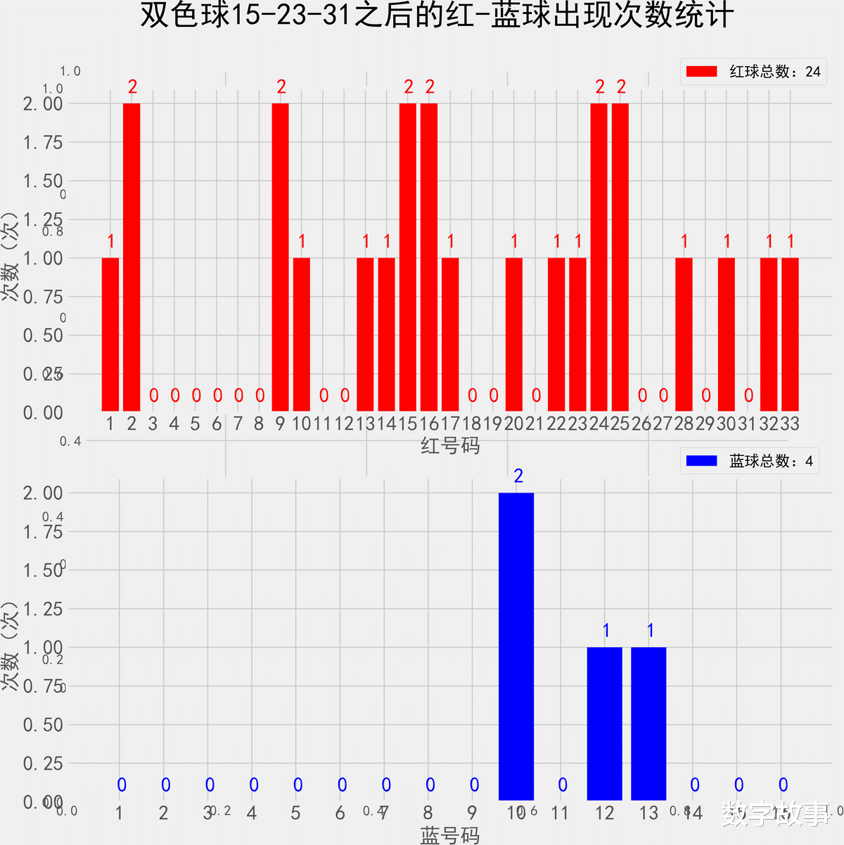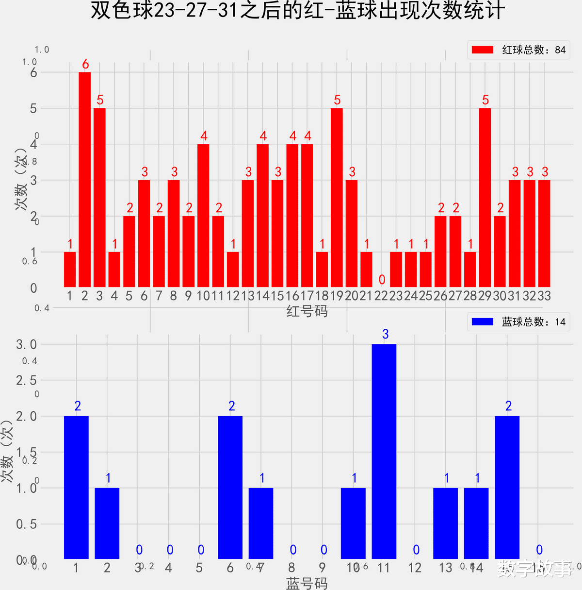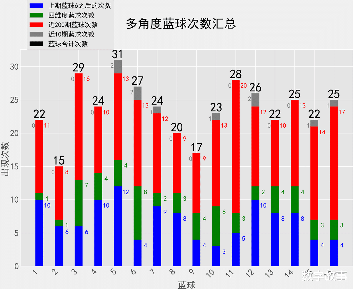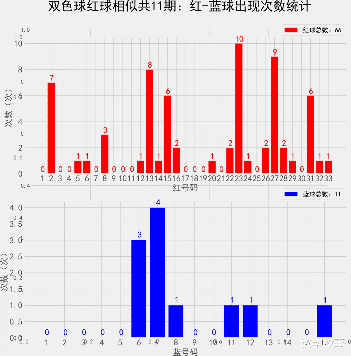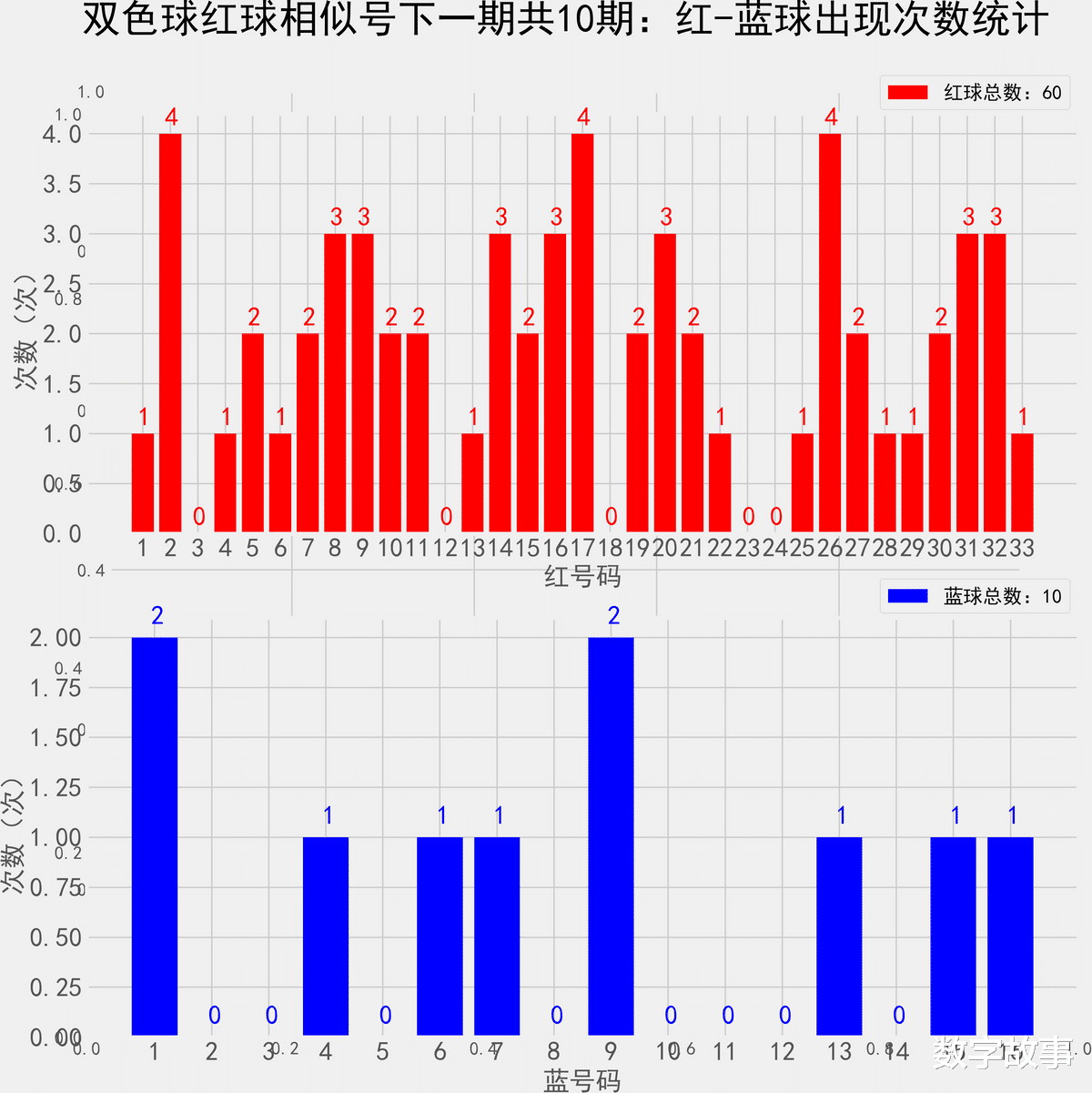 双色球近10期红蓝号统计情况统计样本数据: 60个红球 10个蓝球