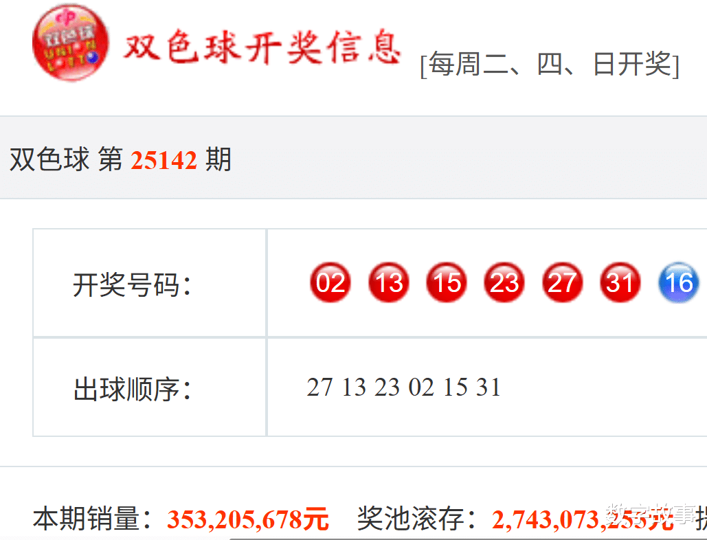 文末有双色球红球等差数23-27-31, 15-23-31的历史统计。【福彩双色球25142期开奖结果及统计】红球号和值111,蓝球16,3注一等奖,奖池27.43亿(2743073255)。