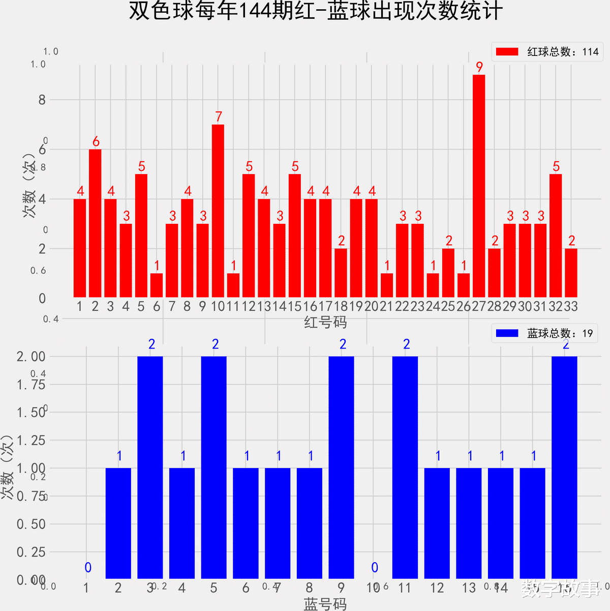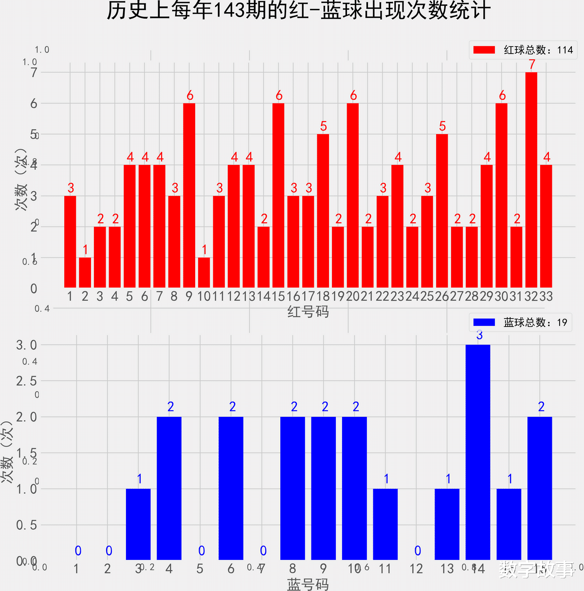 统计每年143期的样本数据:114个红球 19个蓝球