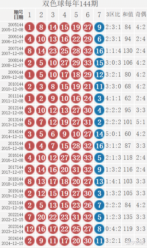 双色球每年144期的出奖号