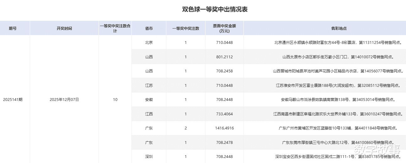 双色球25141期一等奖中奖详情