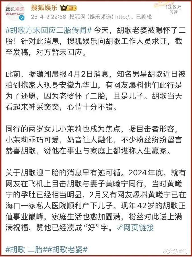 近日,胡歌老婆黄曦宁生二胎的消息,传得沸沸扬扬。