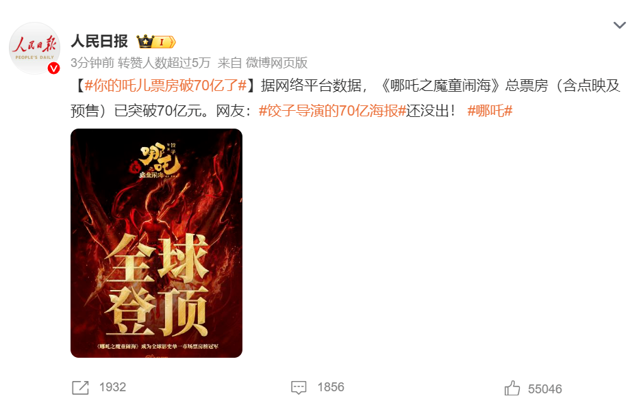 2月6日,电影《哪吒之魔童闹海》登顶中国电影票房冠军;