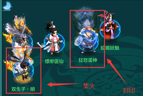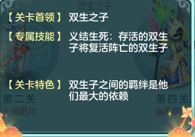 开局封雷神集火双生子明,这里注意集火别带走得留一丝血。第二回合控制血线顶住对面的输出,第三回合通过爆发把明、暗两个一起带走这关就稳了。这关的难点就在于玩家对血量的把控,如何同时把双生子同时带走。