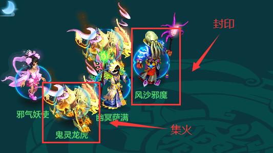 开局封邪魔集火老虎,跟上一关一样注意把老虎打残别带走。这关的难度和第二关差不多,主要难点就在于两只带超级鬼魂术的老虎,这里建议大伙儿带无名谷孩子或者变驱鬼卡天魔孩子进行克制,二者有其一这关稳稳过。