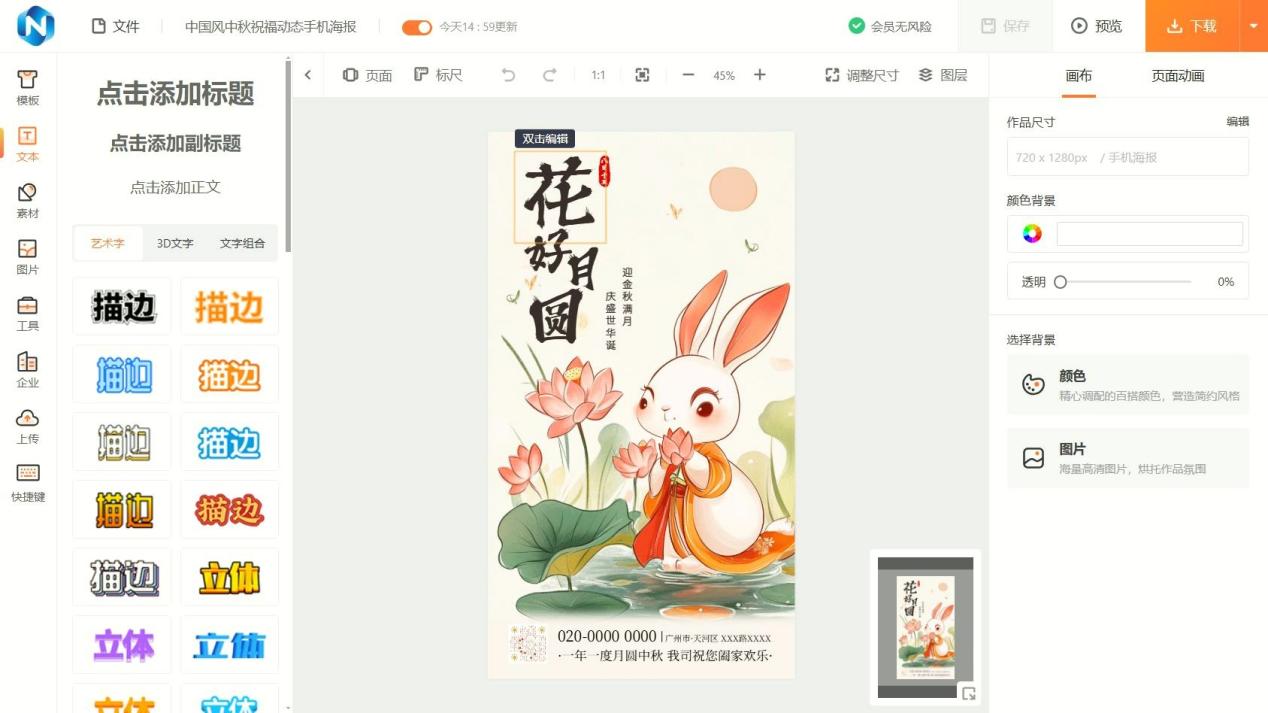 固乔评分:9.6/10基础操作逻辑清晰,拖拽式设计易上手,自带不少行业专属模板,适配特定场景需求。但模板无新手分类,需手动筛选查找,部分功能术语无解释,调整图片特效时需手动调试参数,零基础用户首次使用需花30分钟熟悉,上手流畅度尚有优化空间。