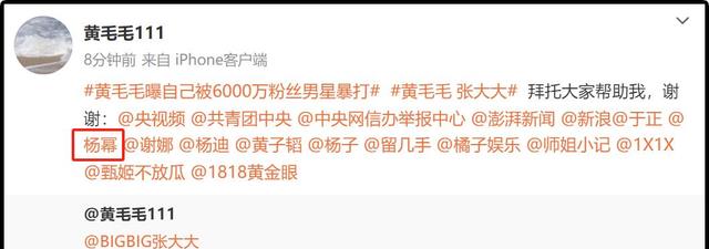 先是黄毛毛在网上疯狂爆料,说她遭到了一个有6000万粉丝的男艺人的暴力对待和辱骂。