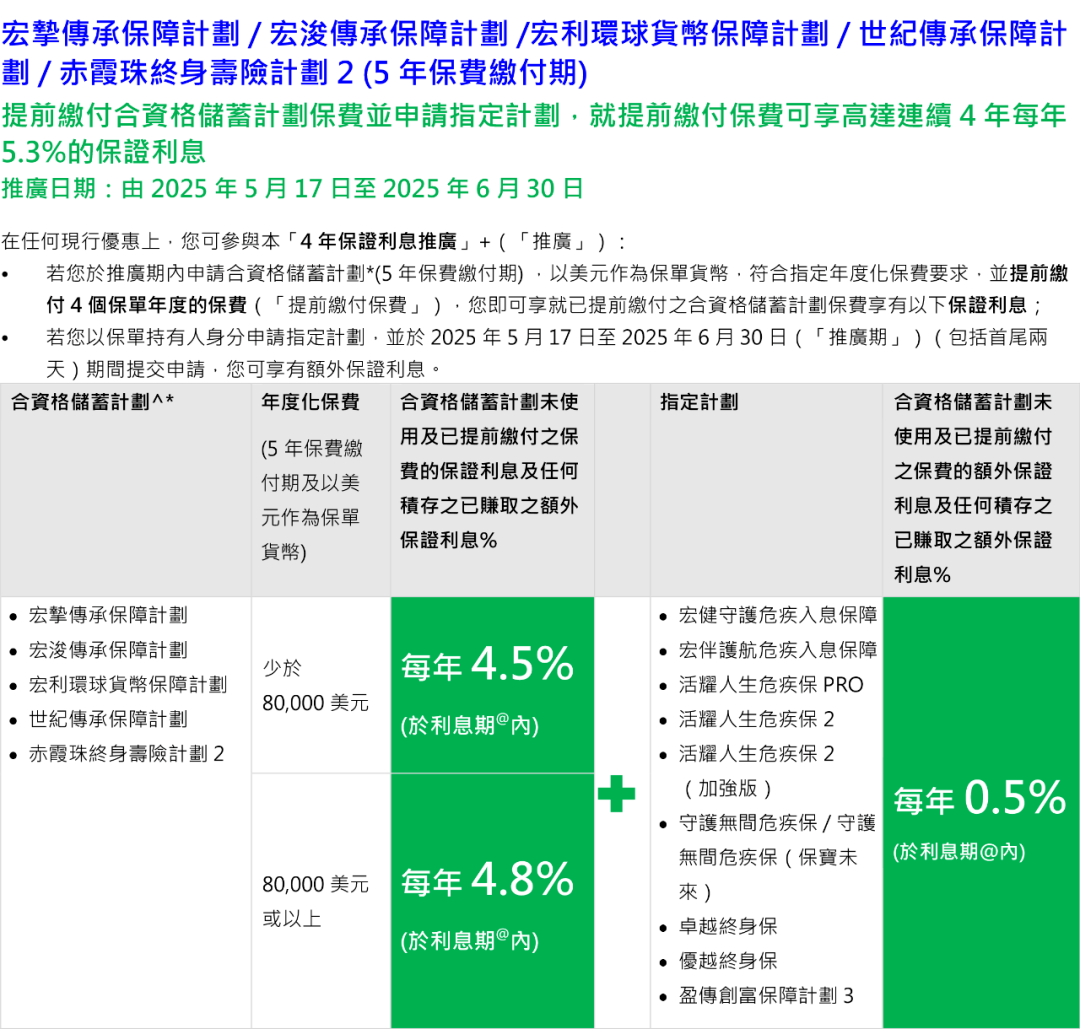 8万美元以上,享受4.8%保证特惠利率,相当于52.8%首年保费,如果同时投保危疾/人寿等,额外享0.5%预缴利息也就是5.3%,相当于首年保费的58.8%;