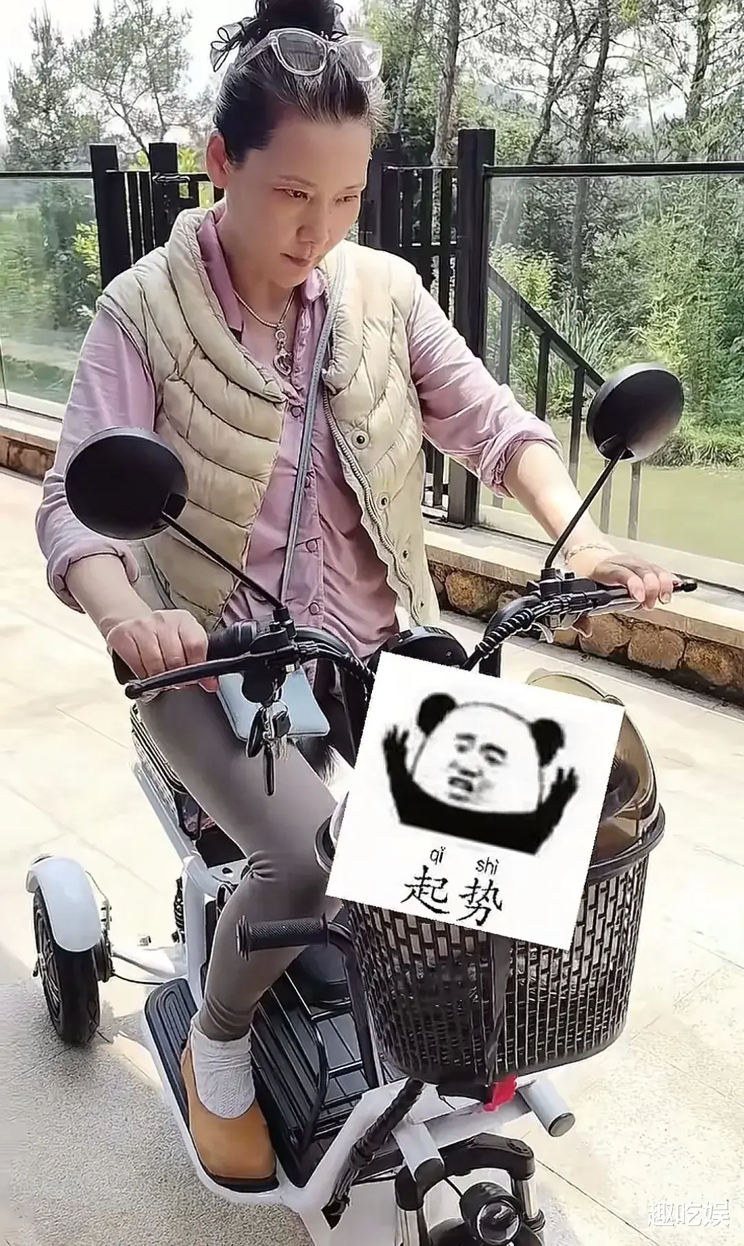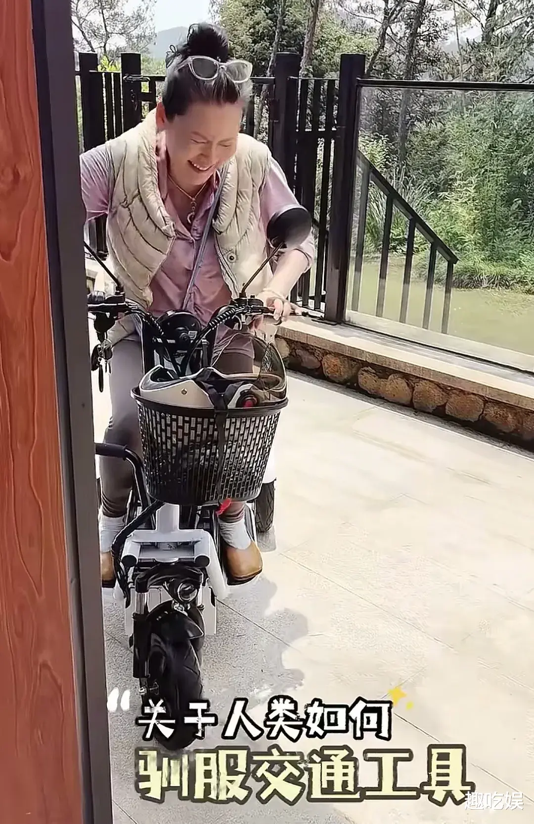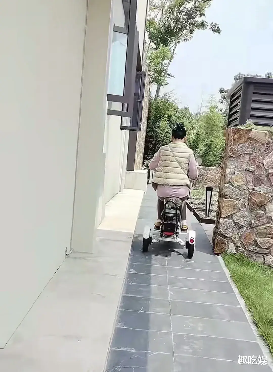 近日,何赛飞在社交平台上发布了自己在别墅里学习骑电动三轮车的日常视频。