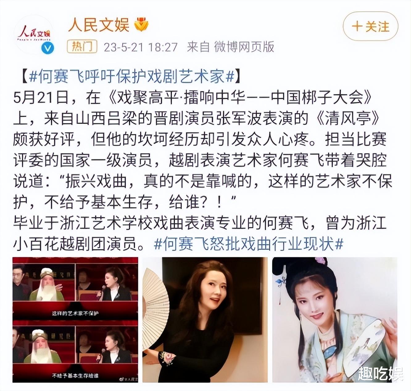 在一个节目中,何赛飞在镜头前大胆发言,怒批行业现状,为一位1500块工资的戏剧演员发声。