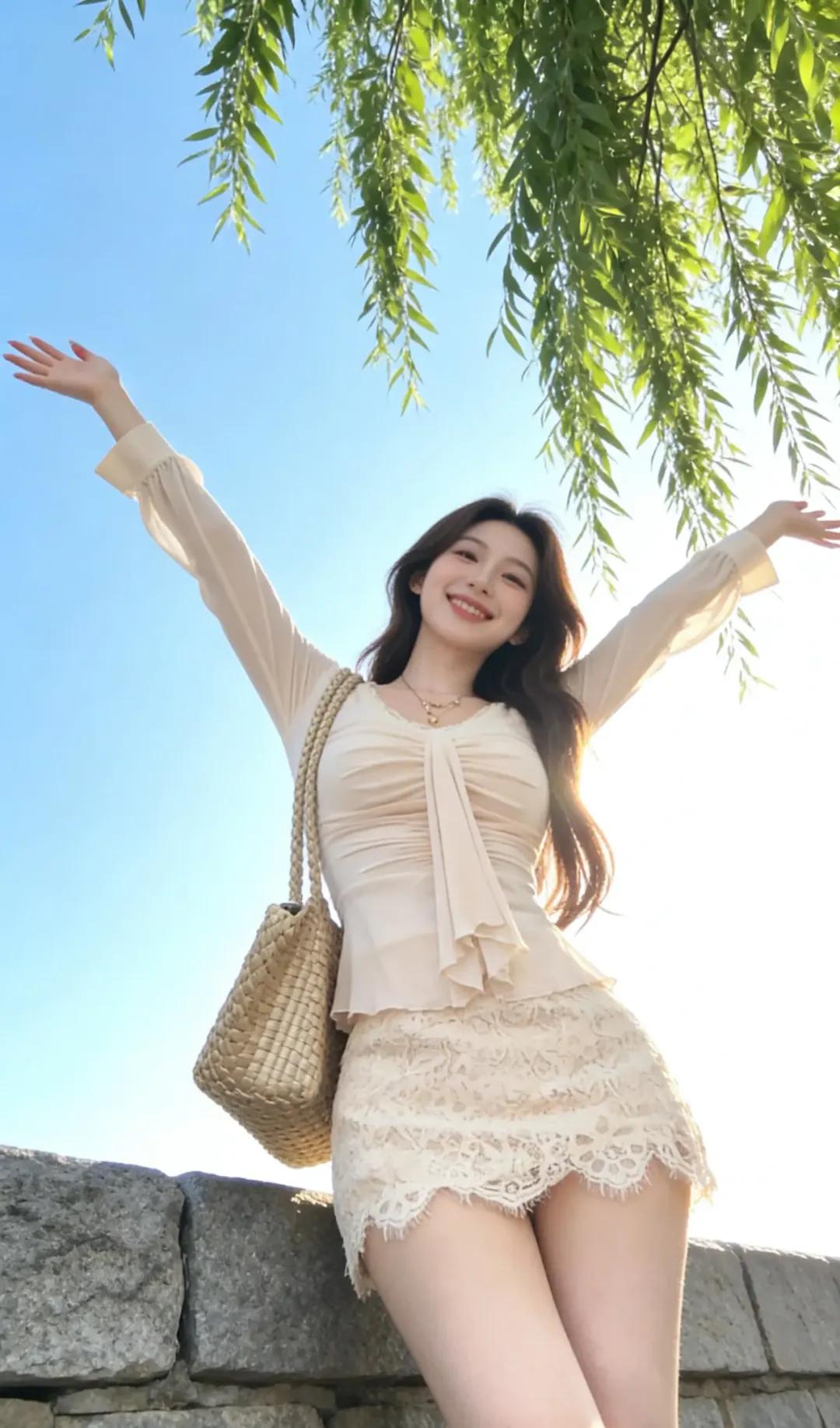 仰拍拍照用双手张开往上举的动作很适合配合蓝天,交叉腿站立让下半身看起来更轻盈,手臂向上时画面会显得更有延展感,整个人状态看起来轻松又有活力,自然就很出片。