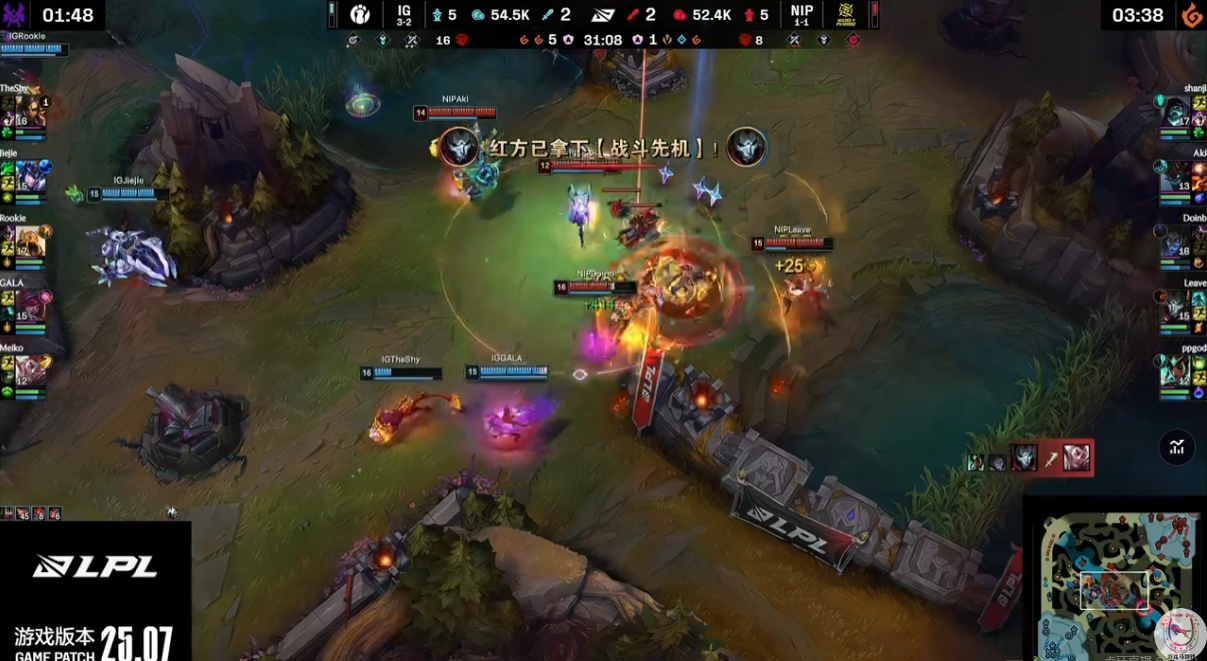 Theshy又是一个人出现在中路,这次没有队友在身边也没有闪现,直接被秒。IG原本经济优势很大,但是在上单连续送节奏之后,NIP逐渐追平经济差。