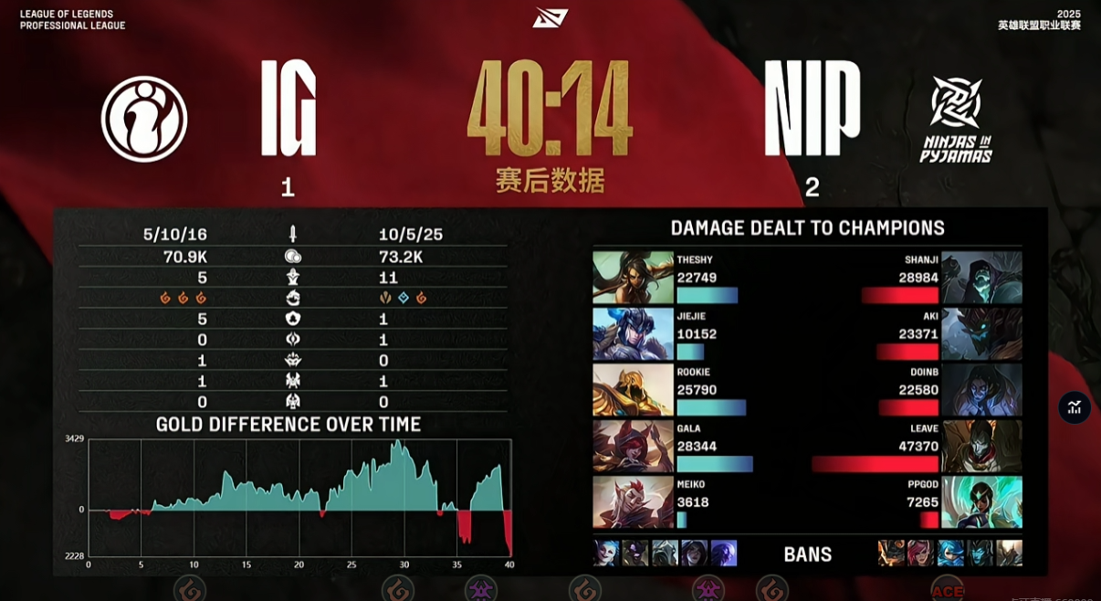 IG和NIP每一局都打了40分钟以上,两队的实力确实很接近,旗鼓相当的对手。IG第三局一度有很大的经济优势,但是送了太多失误了。