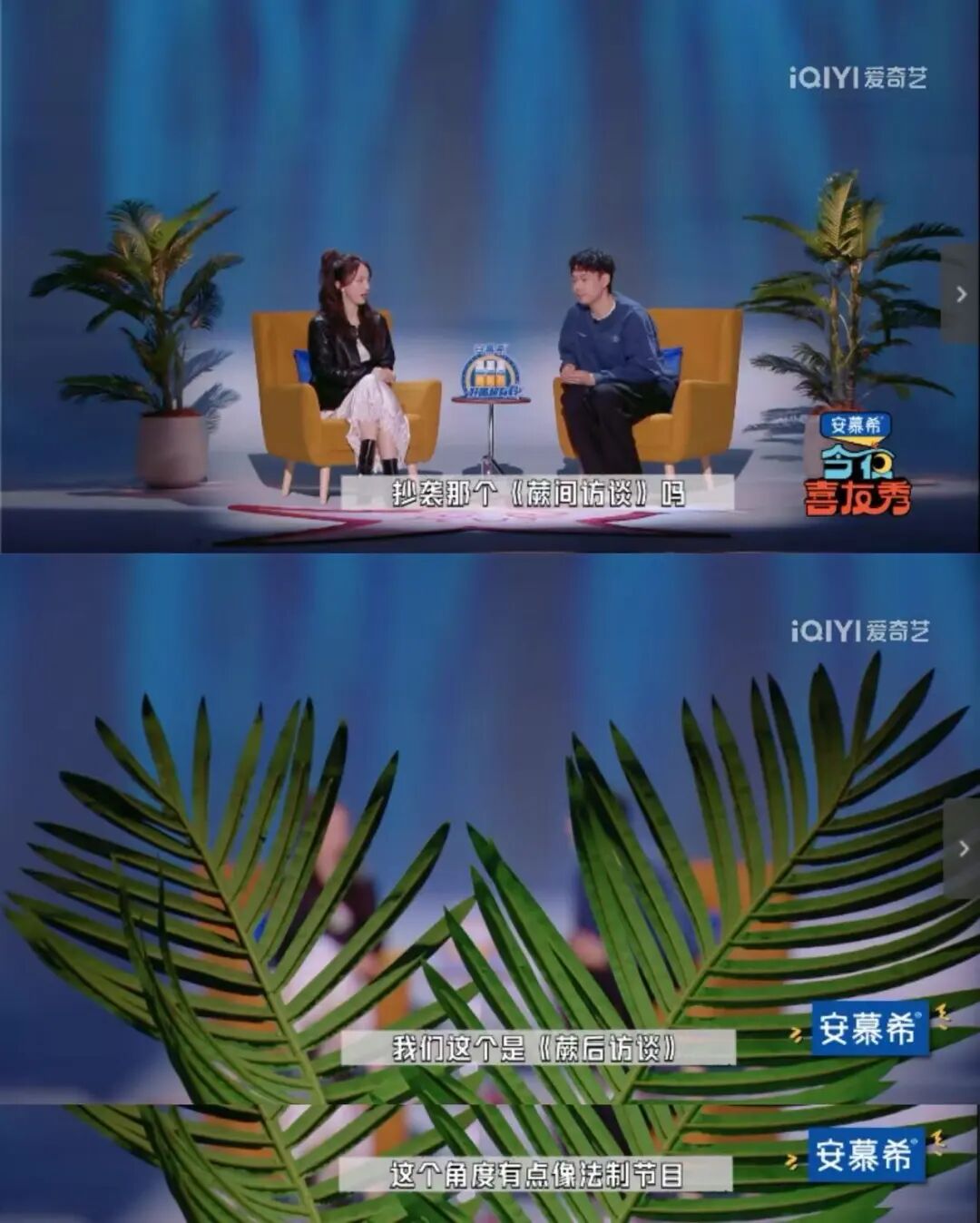 当小北抛出坊间关于董璇情感的一众调侃,董璇从容接住后主动发刀,评价小北的访谈“好像模仿《蕨间访谈》”没什么新鲜。小北马上搬来一盆蕨类植物挡住镜头弱弱辩称“我们可以是《蕨后访谈》”,此时董璇反应极快地贡献出了这一期最具观察力的笑点——“现在这就是法制节目了”。