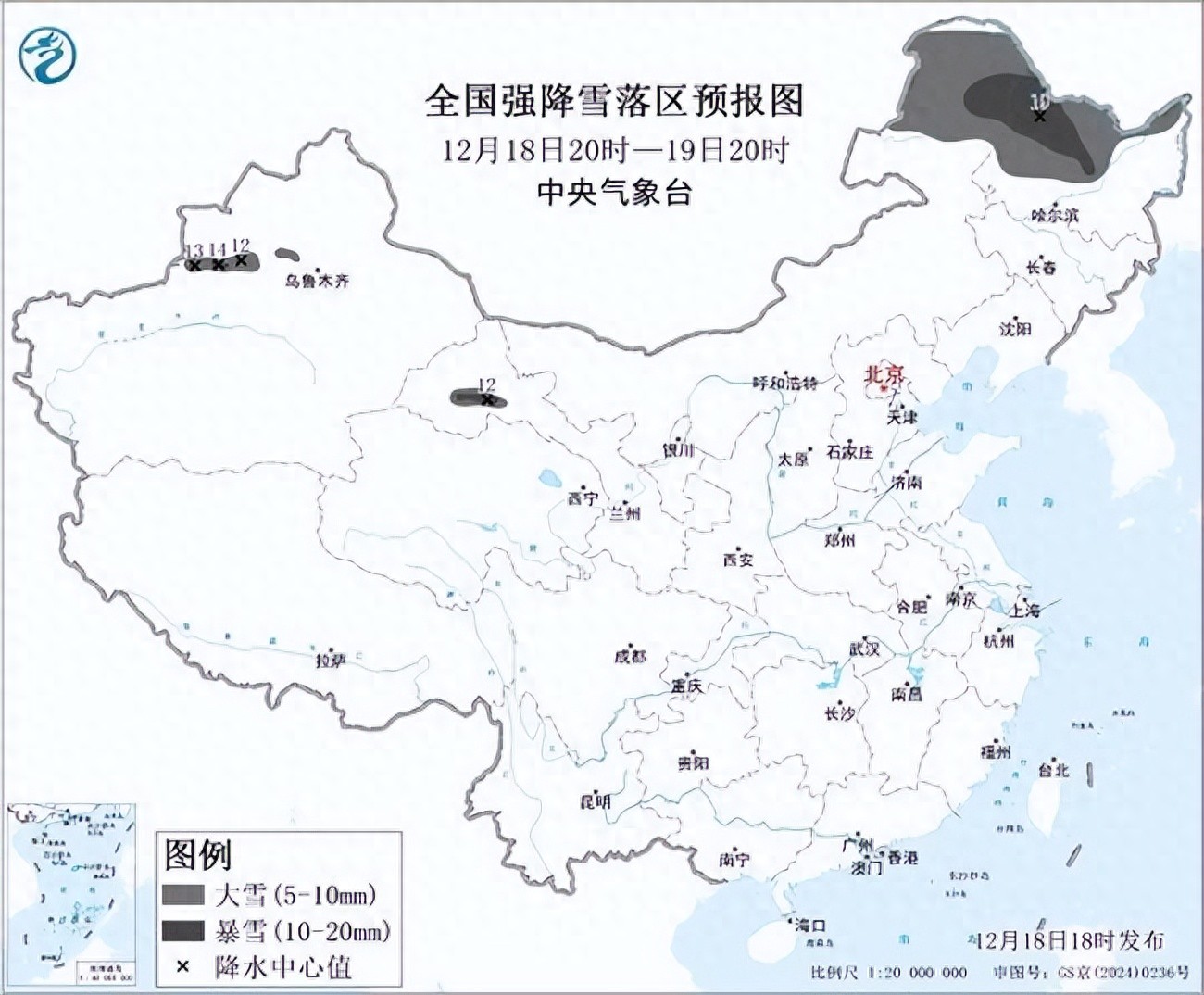 预计12月18日20时至12月19日20时,内蒙古东部、黑龙江中北部、新疆伊犁河谷和天山中部北侧、甘肃西部等地部分地区有大雪,其中,内蒙古东部、黑龙江北部等地部分地区有暴雪(10~19毫米)。上述部分地区新增积雪深度8~15厘米,黑龙江中北部局地可达18~22厘米。