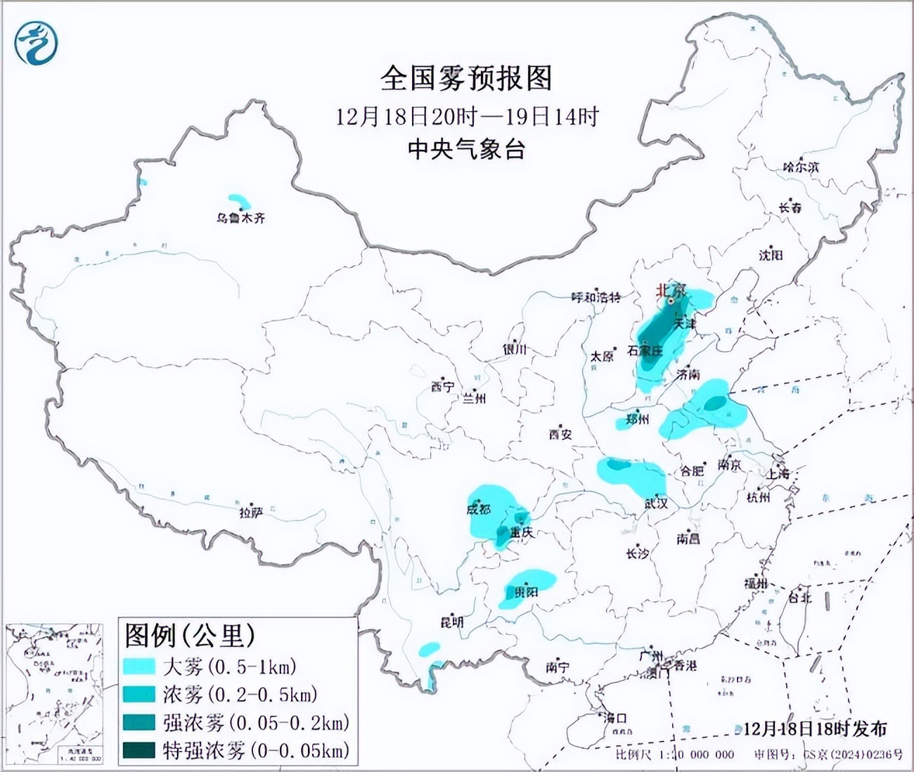 预计,18日夜间至19日上午,北京、天津、河北中南部、河南东北部、山东南部、江苏北部、安徽北部、湖北北部、四川盆地中南部、贵州中部等地的部分地区有大雾,其中,北京中东部、河北中南部、天津西部、山东南部、湖北北部、四川南部、重庆西南部等地的部分地区有能见度低于500米的浓雾,局地有能见度低于200米的强浓雾。