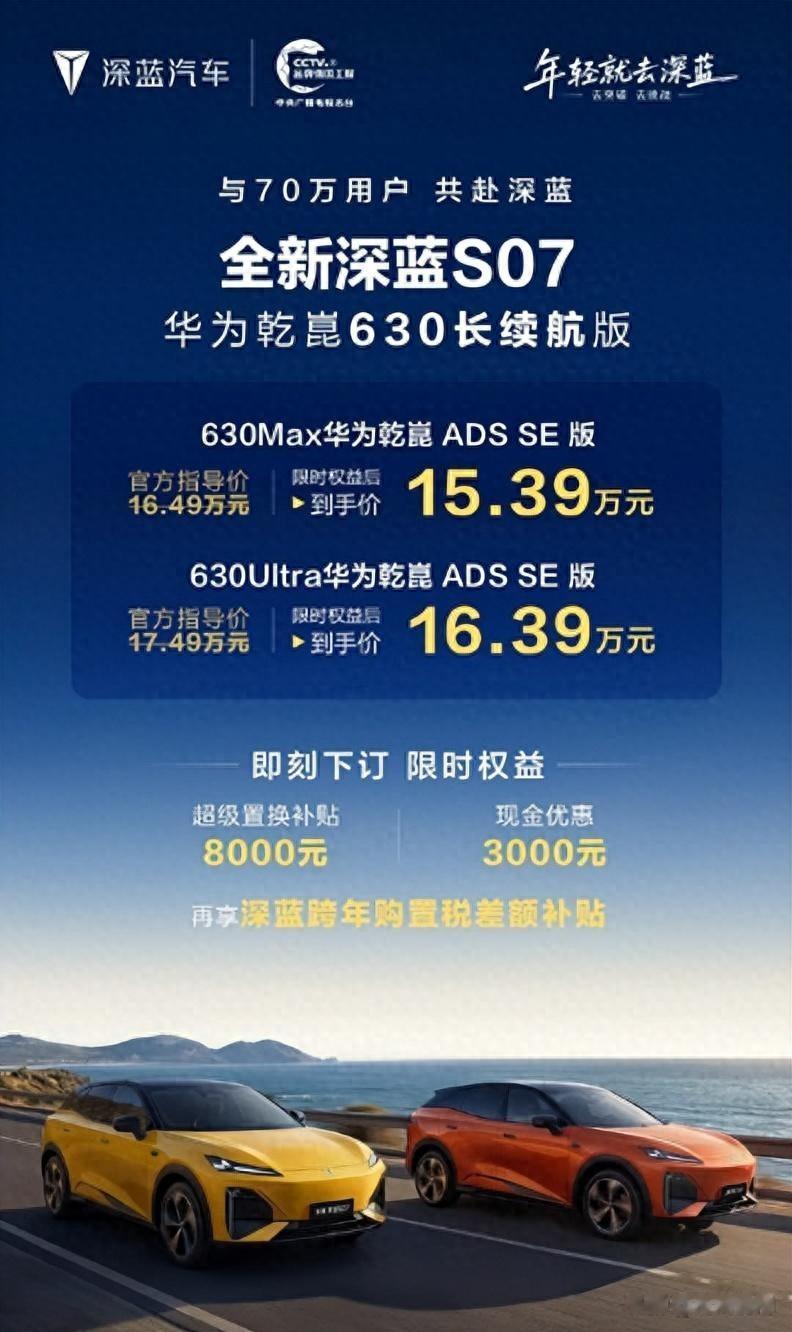 在长安汽车的新能源战略布局中,深蓝品牌持续推动产品矩阵的完善与进化。近日,深蓝S07新增华为乾崑630长续航版正式上市,以CLTC工况630公里的纯电续航、全系标配的华为乾崑智能驾驶辅助系统为核心卖点,瞄准主流家用市场对续航与智能的双重需求。新车推出Max与Ultra两款配置,官方指导价分别为16.49万元与17.49万元,上市限时权益后起售价下探至15.39万元,展现出较强的市场竞争力。本文将对其产品力、市场竞争格局及购车选择进行系统分析。