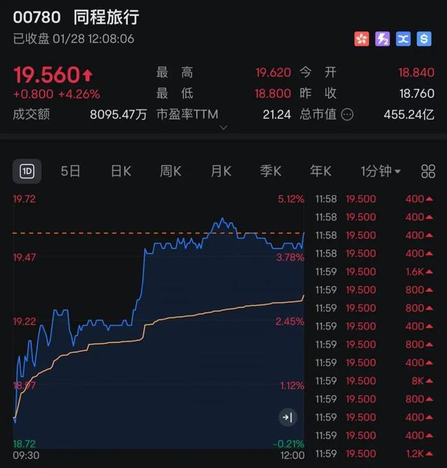 同程旅行股价上涨4.26%。