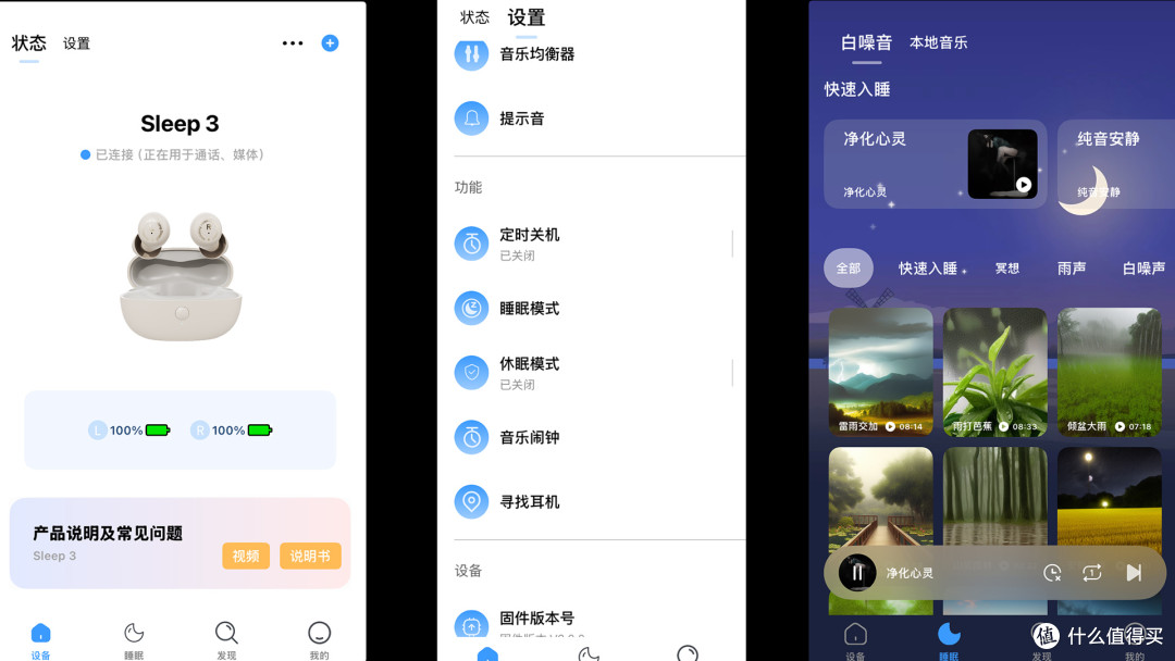 虽然这是一款睡眠耳机,单量相比正常的 tws 耳机稍小那么一点,但是在音质表现方面完全是可圈可点的,Wedoking 耳机的音质经过了专门的调校,整体音感更加柔和,不会对入睡过程产生干扰。配合耳机专属 APP 中丰富的助眠音乐资源,如 “山间雨林” 中淅淅沥沥的雨声、清脆的鸟鸣声以及清风拂过树叶的沙沙声,每一种声音都定位清晰、还原度高,仿佛将用户带入了宁静的大自然之中,能够在短时间内帮助用户放松身心,进入深度睡眠状态