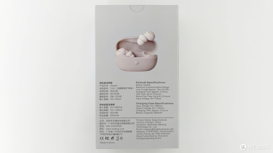 wedoking 睡眠耳机三代的包装十分简洁,正面是产品实拍图,文字注明了品牌和产品型号,包装的背面则是耳机的详细参数及生产信息。