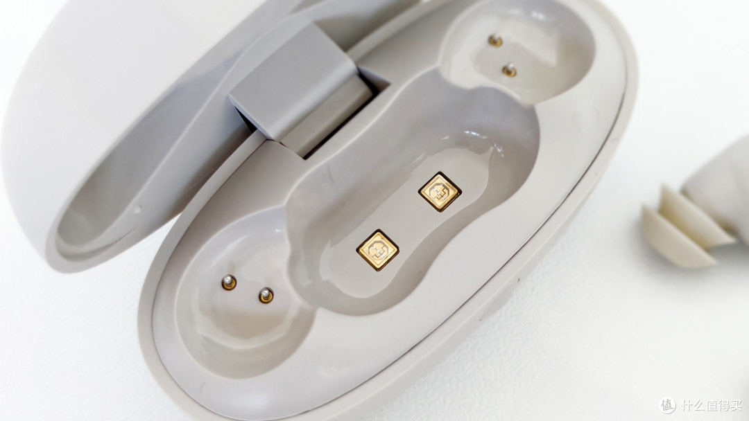 仔细观察的话就能看到耳机仓底部还有两个led 灯,这个就是用来能耳机杀菌的紫外线杀菌灯,这个灯会在关闭耳机仓的时候激活,这样每次使用完把耳机放入耳机仓就会自动灭菌。我也是看到了这个功能后才拿出了使用很久的耳机,内部真的是很脏,在使用的过程中一定要注意清洁,之前这方面我是完全忽略掉的,平时使用完都是直接装进耳机仓完事。
