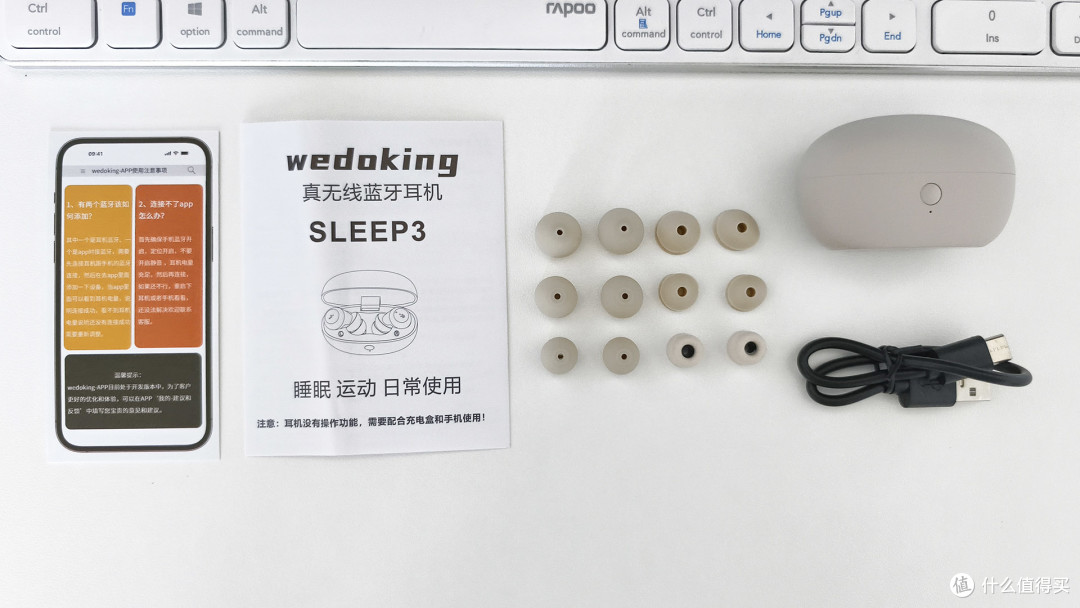打开包装盒就能看到耳机的全套配件,除了标准数码产品都标配的typec 数据线和说明书外,这款wedoking睡眠耳机三代耳机居然额外配备了6对耳帽,这可真的是为了适配所有人,力争让大家都能够拥有最舒适的佩戴。