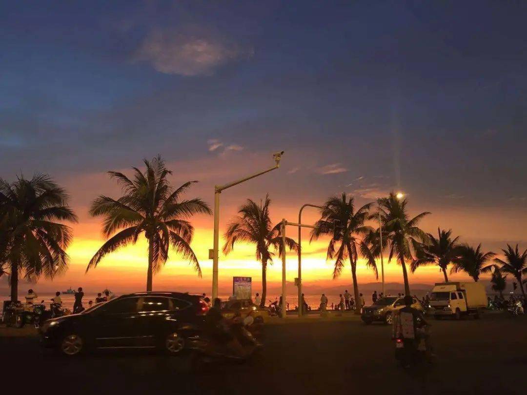 椰梦长廊是环三亚湾修建的一条著名的海滨风景大道,绵延20余里,一侧为优美迷人的热带植物园林,一侧为银色的沙滩、蓝色的大海,黄昏时分的景色更美,可以观看浪漫的海边晚霞。