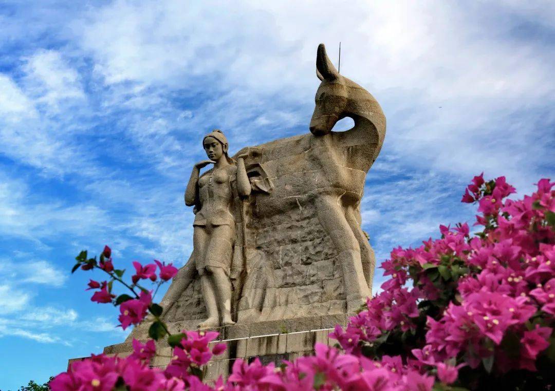鹿回头公园位于三亚市区东南鹿回头半岛上,素有“南海情山”的美誉。这里流传着一个美丽动人的爱情传说:有一位青年追赶一只坡鹿来到悬崖,青年正要张弓搭箭,忽见坡鹿一回头变成一位美丽的少女,最后两人结为恩爱夫妻定居下来,此山因而被称为“鹿回头”。