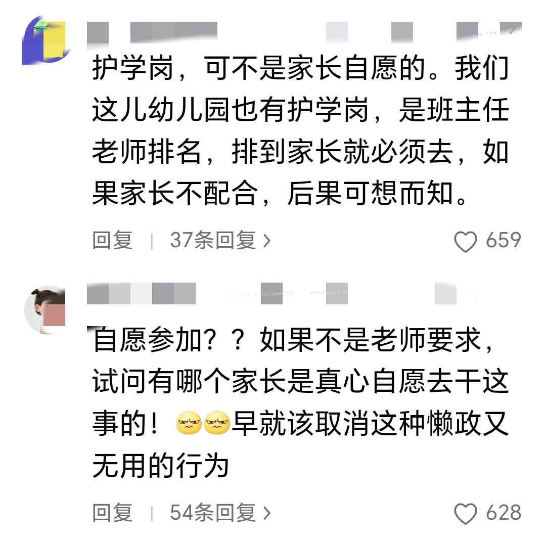 对于学校说的护学岗是家长们自发组织的行为,很多学生并不认同,毕竟大家都是有工作的,如果不是班级老师安排的,谁会“没事找事自愿”的来值岗呢?