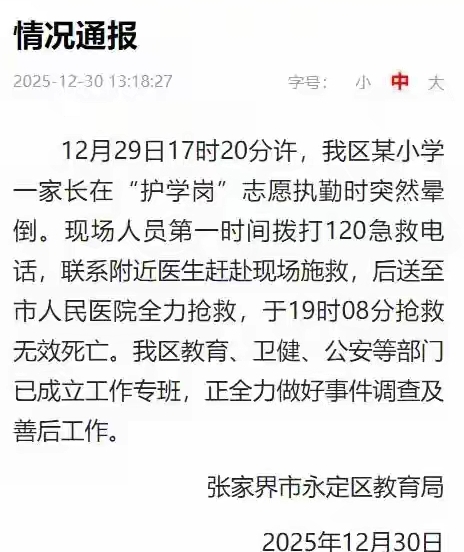 12月29日,有湖南张家界网友曝出一条消息,说是一位学生家长执勤护学岗时突然晕倒,送医院后抢救无效去世,年仅45岁,留下两个儿子,一个17岁正在上高中,一个正在读小学三年级,引起了网友们的关注。