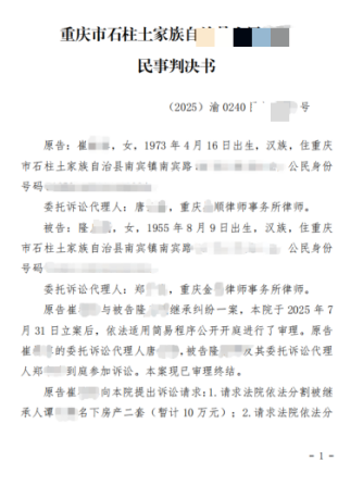法院就一审(2025)渝0240民初4267号继承纠纷一案作出一审判决,以 “未形成事实收养关系” 为由,驳回了崔女士的诉讼请求。这一判决让崔桂容难以接受:“当年我年纪小,户口迁移后因舅母嫌弃农村身份被迫返回原生家庭,但户口一直未迁出,三十多年来户籍系统一直认可我是 ‘长女 '”。