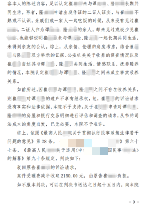 然而,舅母隆某对此全盘否认。她称,自己与谭某婚后约定成为丁克家庭,从未有收养子女的意愿,崔女士的户口登记是当年其原生家庭为办理 “农转非” 采取的 “空挂”行为,且崔女士从未与他们共同生活,不存在事实收养关系。