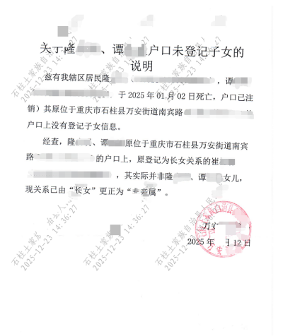 2025 年1月,谭某因病去世,却成为崔女士权益受损的开端。2月19日,舅母隆某独自前往相关单位注销了谭某的户籍;仅仅5天后的2月24日,隆某便向相关单位申请变更崔女士的亲属关系。让崔女士始料未及的是,相关单位在未通知其本人、未核实其意见的情况下,仅凭隆某一方陈述,就将其与谭某的 “长女”关系变更为 “非亲属”。