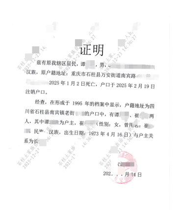 户籍登记 “长女”三十八载,亲人离世突遭 “除名”时间回溯到1987 年9月,幼年的崔女士手持沿溪乡相关单位签发的 “接抱”迁移证,将户口从原生家庭迁至舅舅谭某名下,户籍登记明确标注与户主谭某为 “长女”关系。据崔女士回忆,当年村支书等证人证实,谭某与妻子隆某婚后未生育子女,确有接抱外甥女为女的意愿,才通过合法户籍迁移手续将她纳入家庭户口。此后三十八年,这页户口本成为崔女士与舅舅一家亲缘关系的官方证明,她的户口一直在谭某户内。