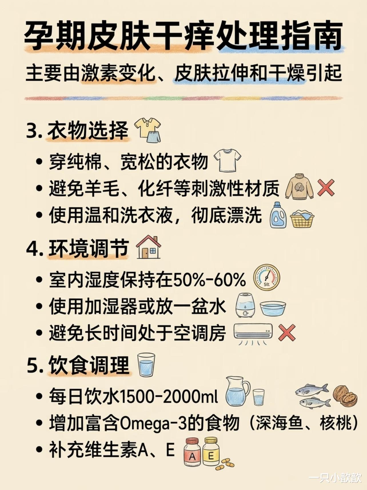 科学护理可以用这些方法:洗澡水温37℃以下,时间控制在10分钟内,过热的水会洗去皮肤表面油脂,加剧干燥。建议选择弱酸性、无皂基的沐浴露,避免碱性肥皂破坏皮肤屏障,洗澡后用柔软毛巾轻拍吸干水分,切勿用力擦拭。沐浴后3分钟内是涂抹保湿产品的黄金期!此时皮肤微湿,锁水效果最佳,优先选择含神经酰胺、透明质酸、燕麦提取物等成分的孕妇专用护肤品,避免酒精、香精、视黄醇等刺激性成分,腹部、大腿等易长妊娠纹部位,可叠加使用含积雪草、乳木果油的护理油,增强皮肤弹性。衣物选择纯棉、真丝等天然材质透气性好,能减少摩擦刺激,避免化纤、羊毛等易产生静电的衣物,新衣服穿前充分洗涤去除化学残留,冬季采用洋葱式穿衣法,内层吸汗、中层保暖、外层防风,防止出汗后汗液刺激皮肤。空调房或暖气房内放置加湿器,将湿度维持在50%-60%,若没有加湿器,可在室内放一盆清水或悬挂湿毛巾,外出时佩戴围巾、手套,减少冷风直接接触皮肤。