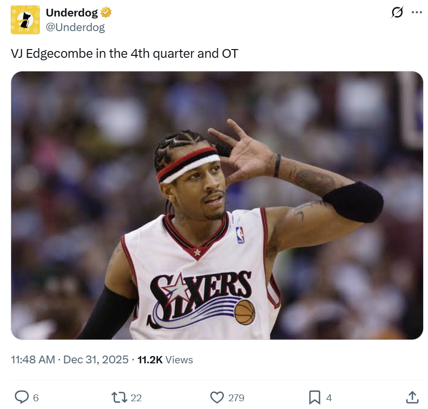 面对埃奇库姆这样的表现,美媒Underdog晒出艾弗森配图,直言:“埃奇库姆末节与加时像极了那个男人。”