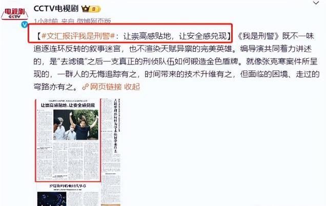 得到了收视率突破4.1的好成绩,央视,人民网,文汇报等官方媒体,都转发,发文称赞《我是刑警》这个作品。
