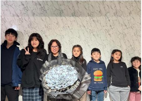 卫斯理在社交媒体上分享了一张与姐姐、姐夫以及妻子、母亲的合影。照片里,作为寿星的贾妈妈站在中央,手里拿着一大束花,笑得非常开心。她的女儿贾静雯和儿媳朱芯仪分别站在她两边,做着比心的手势,让人误以为是母女三人在一起。