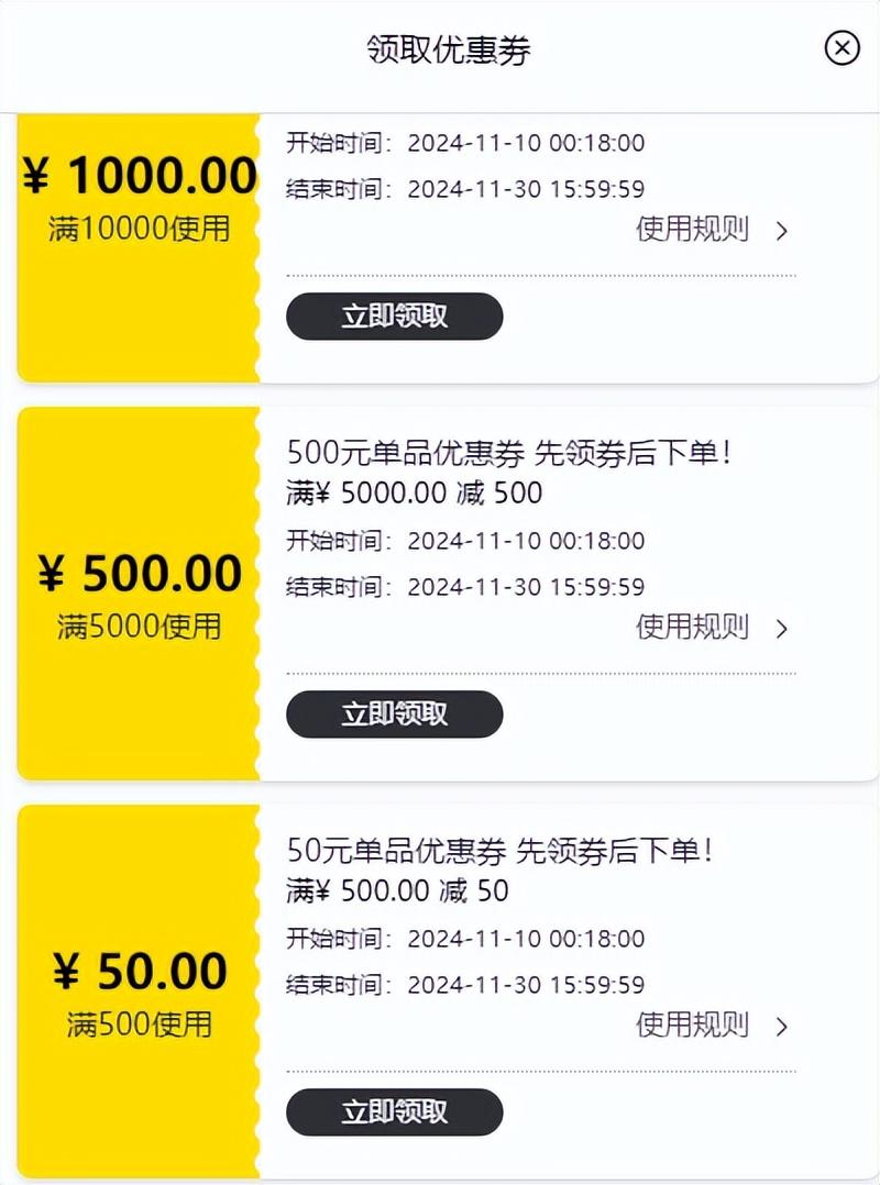 单件商品满10000减1000、满5000减500、满500减50优惠