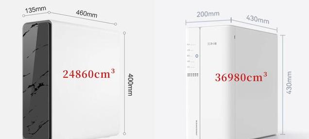「隐藏水箱」和「增加滤芯尺寸」两种方法,都会增加净水机的体积。下面是两台净水机的尺寸对比▽