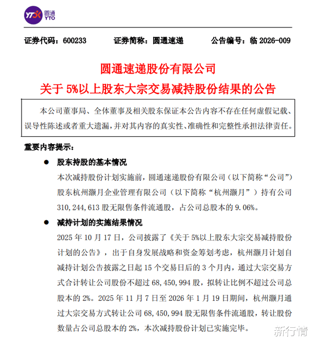 1月19日,圆通速递发布公告,公司持股5%以上股东杭州灏月企业管理有限公司通过大宗交易方式累计累计套现约10.89亿元。