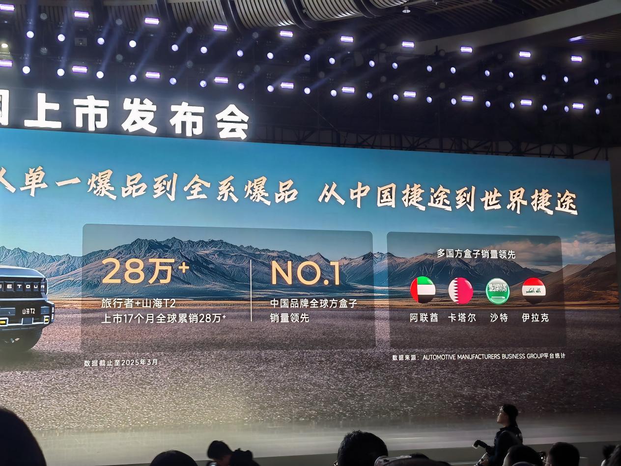 不过,随着捷途旅行者的热销,大家骤然发现,奇瑞“野”起来,真的连长城的地盘都敢抢。在3月的捷途自由者发布会上,捷途将旅行者、山海T1、山海T2等摆成一排,背靠几个大字“方盒子冠军家族“丝毫不客气。奇瑞拿出全球数据做支撑:旅行者+山海T2,上市17个月,全球累销超28万台,并且列出了畅销国家。