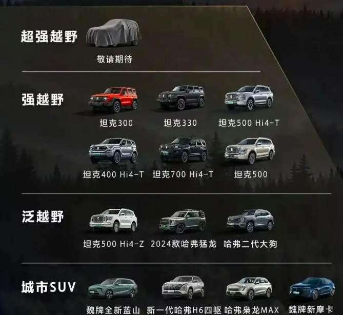 视线转移到越野江湖,长城在自主品牌中确实是老大哥级别,深得老司机拥趸。车型布局方面,哈弗大狗系列、猛龙系列油电并举,再加上坦克品牌,长城汽车当之无愧是方盒子NO.1。