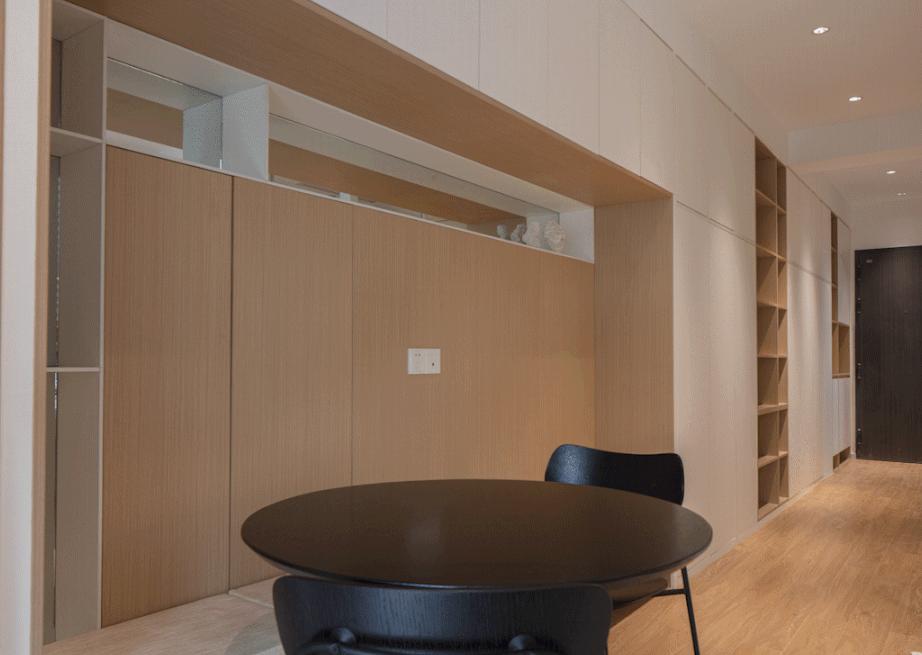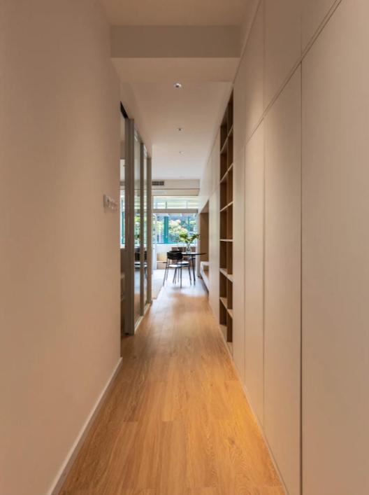 入户进来就是一套狭长的玄关走廊,从一进门就看到了墙面做了很多的收纳柜,不仅仅只是鞋柜,还有衣柜,其他功能的收纳柜,以及展示柜等等,整面墙的收纳设计真的很让人叹服。