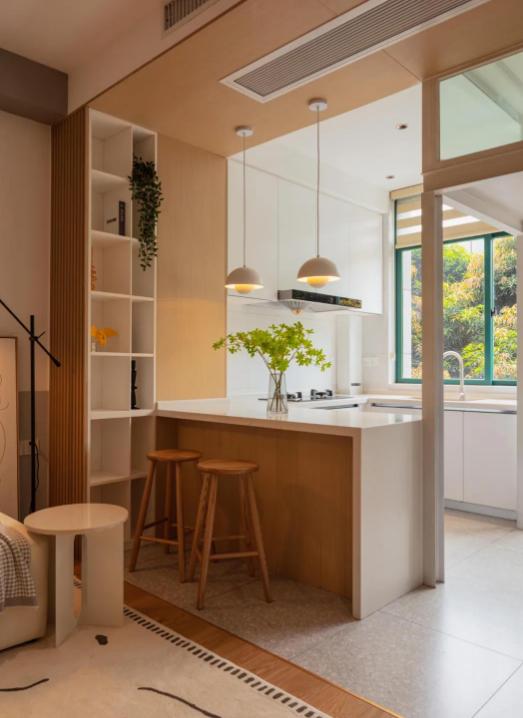厨房和客厅之间的隔断做了一个小小的吧台,而吧台和橱柜做了连接,这边的吧台是吃早餐的时候用的,或者是作为平时喝饮料和工作的区域,这个地方的设计也非常的独特。