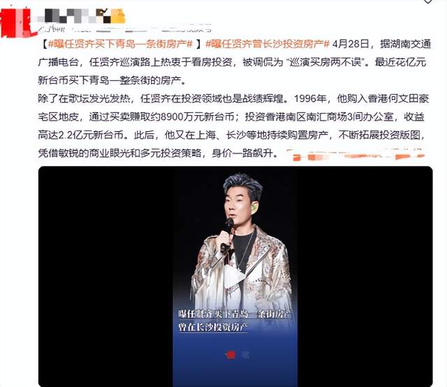 最近,娱乐圈又传来一则让人津津乐道的消息——歌手任贤齐在巡演途中,竟然还不忘买房投资!据台媒报道,任贤齐不仅歌唱事业红火,还是个精明的房产投资者,有消息称其最近更是在青岛买下了一整条街的房产,被网友调侃为“巡演买房两不误”。对此,任贤齐的经纪人否认该内容,对于被指晋升房地产大亨回应称:“齐哥也希望有能力买下青岛一条街,没有的事。”