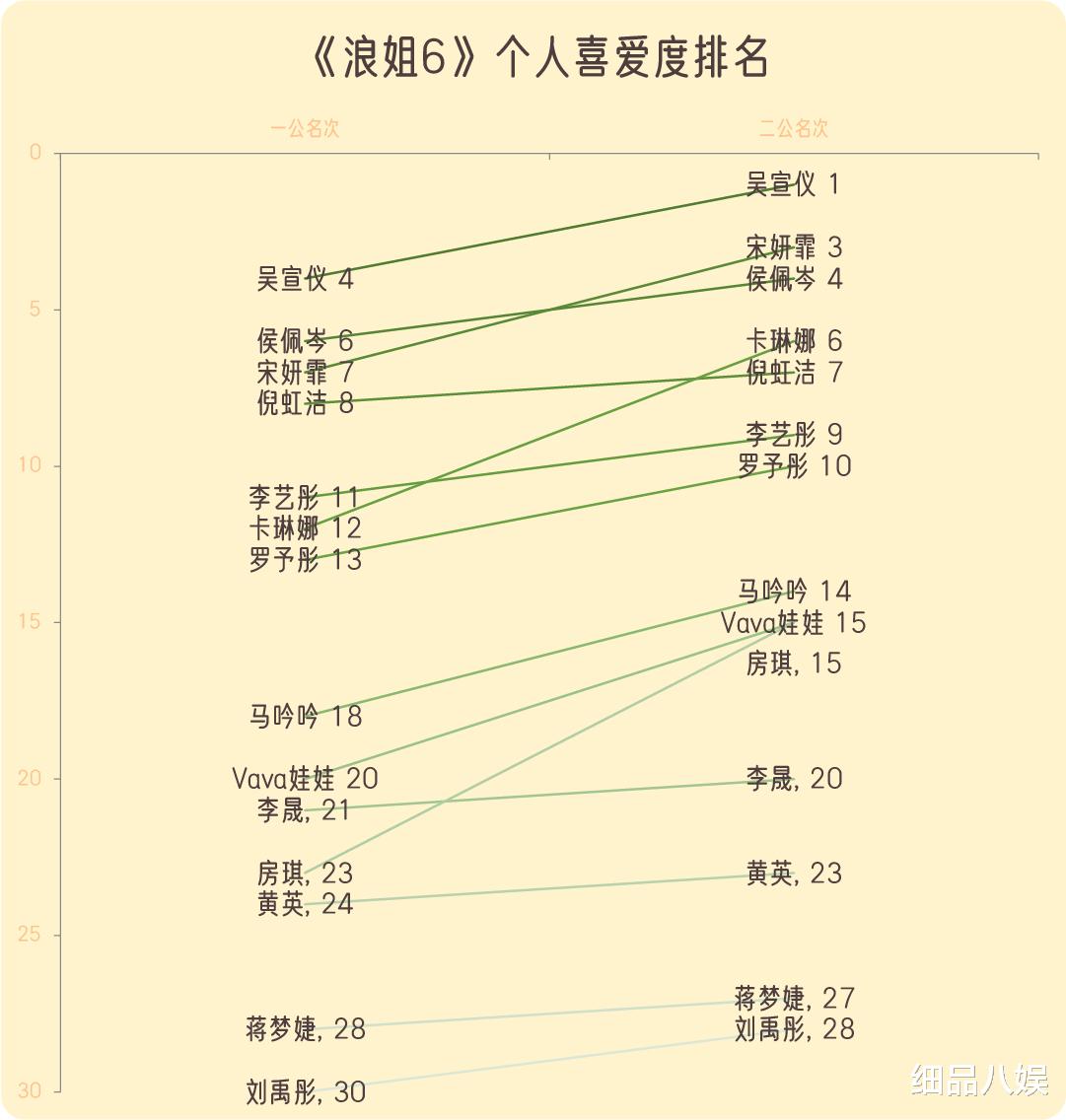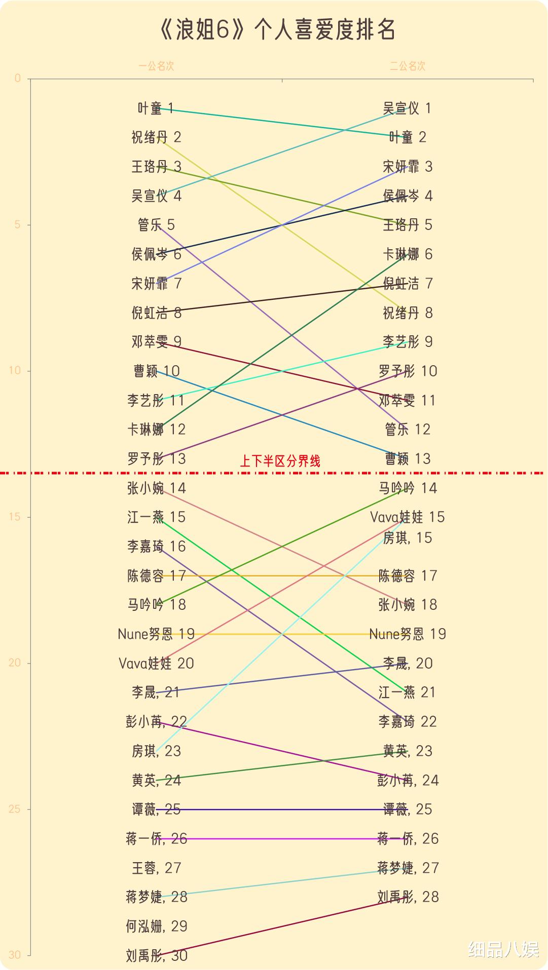 祝绪丹、王珞丹“双丹”双双跌出前三名,吴宣仪、宋妍霏强势登陆三甲集团。吴宣仪甚至力压《浪姐6》主咖叶童,成为了二公的“状元”。