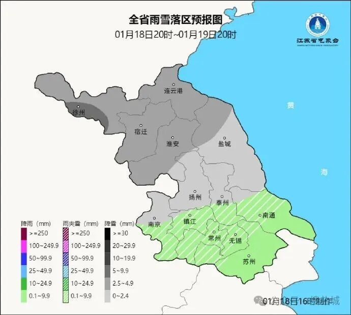 1月18日20时至1月19日20时,沿淮和淮北地区阴有小雨或雨夹雪转中雪,局部大雪,苏南地区多云转阴有小雨或雨夹雪,其他地区阴有小雨转雨夹雪或小到中雪。最高温度:苏南地区7~8℃,淮北北部地区-1℃左右,其他地区4~5℃;最低温度:淮北地区-3~-4℃,沿江和苏南地区2℃左右,其他地区-1~-2℃。全省东北风4-5级阵风6级转偏北风5-6级阵风7-8级。