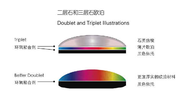 市面上常见的拼合欧泊,主要分为欧泊二层石与三层石,其中 “二层石” 也被称作 “双拼欧泊”,“三层石” 则被形象地称为 “三明治欧泊”。二层石的制作工艺,通常是将切割好的欧泊薄片,通过专用深色胶,黏合在暗色或黑色的基底之上,基底材质可选深色黑玻璃、玉髓或是品质普通的欧泊,目前市面上最主流的双拼欧泊,多以铁矿石作为背景衬底;而三明治欧泊的结构更为复杂,由顶部的透明圆顶(材质多为水晶或亚克力等透明材料)、底部的黑色衬底(常见为黑色塑料片),以及中间夹层的欧泊薄片组合而成,也就是说,这类拼合欧泊里,往往只有中间薄如蝉翼的一层是天然欧泊,其余均为辅助材料,在深色底衬与顶部透明弧面的双重衬托下,欧泊本身的色彩被放大凸显,营造出堪比黑欧泊的惊艳变彩效果。